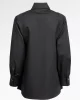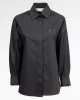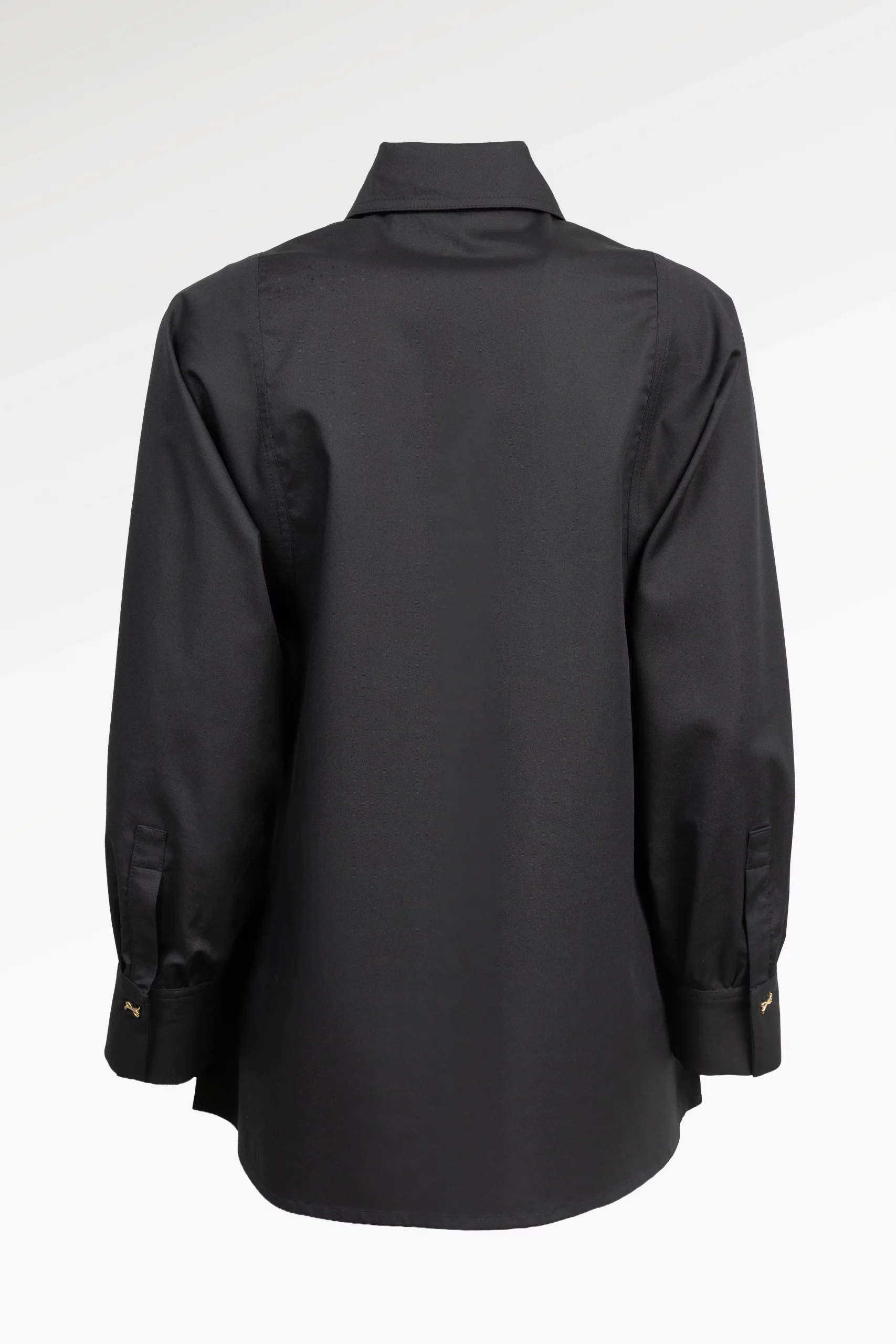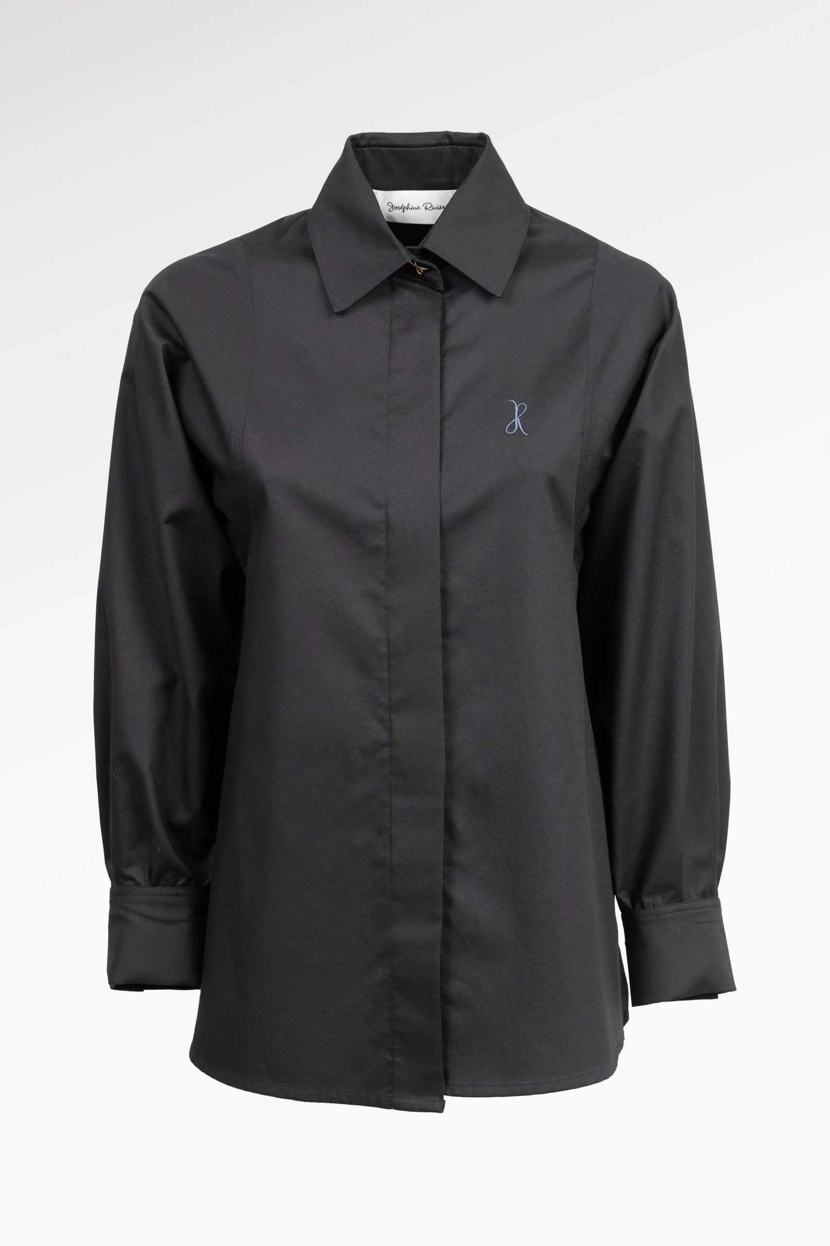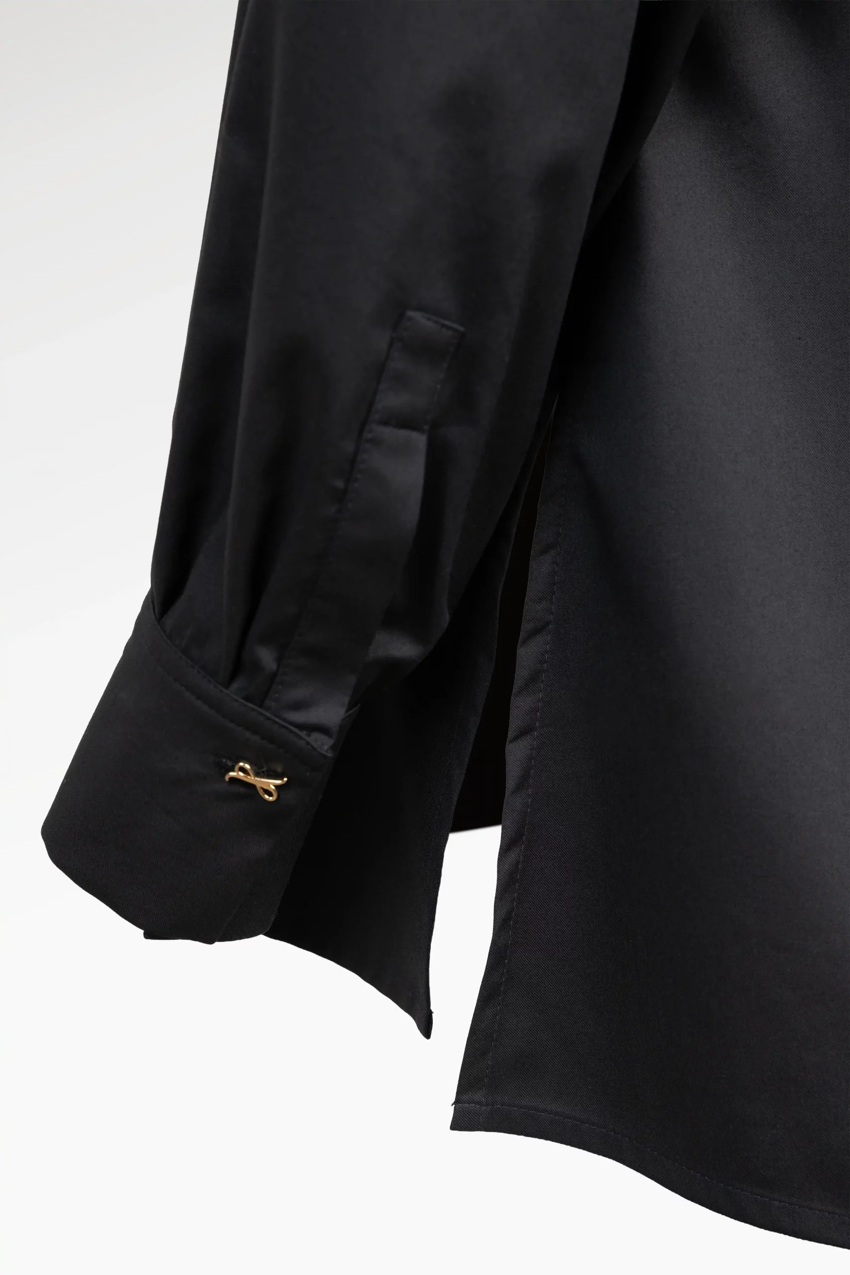 La patte de boutonnage cachée épure la silhouette, tandis que les manches froncées aux poignets offrent du volume.
