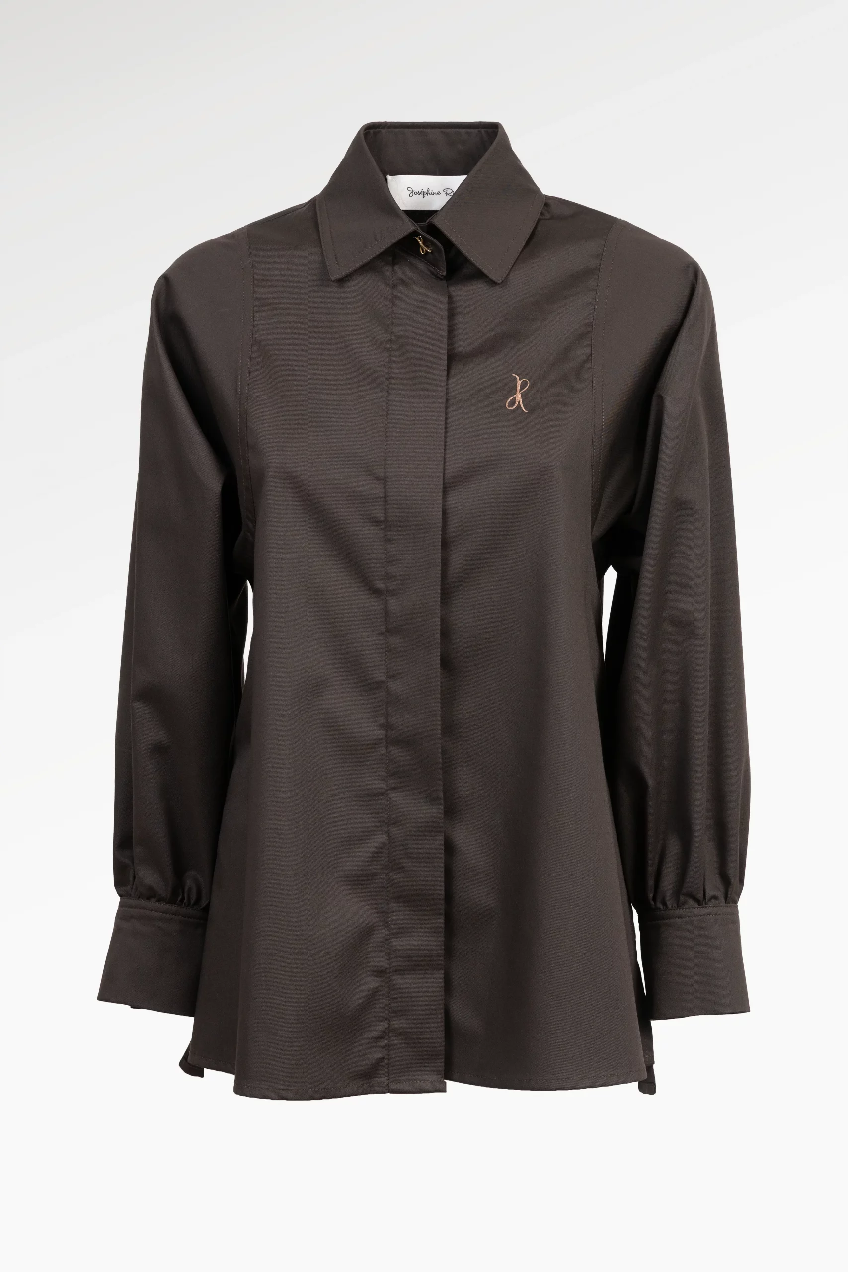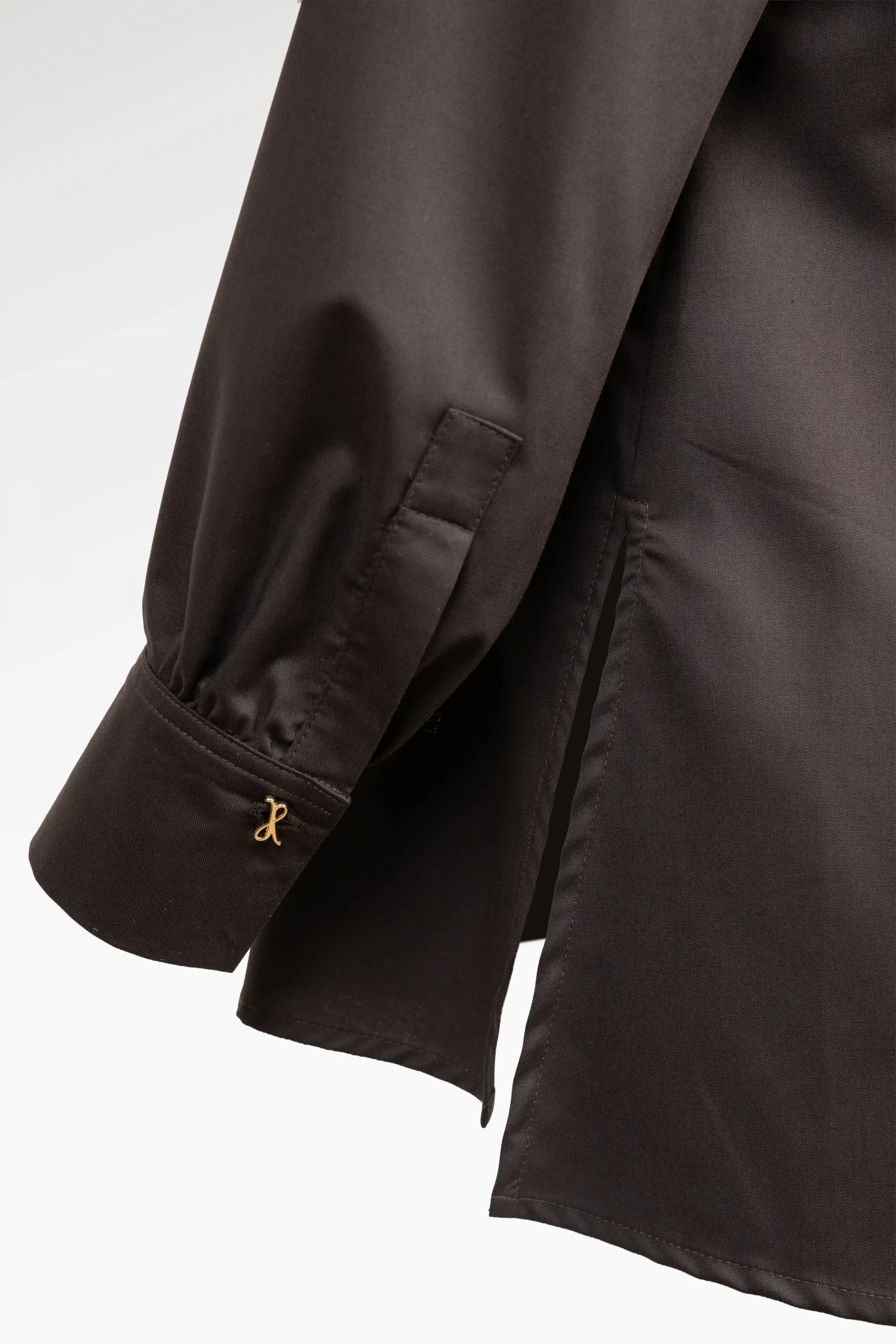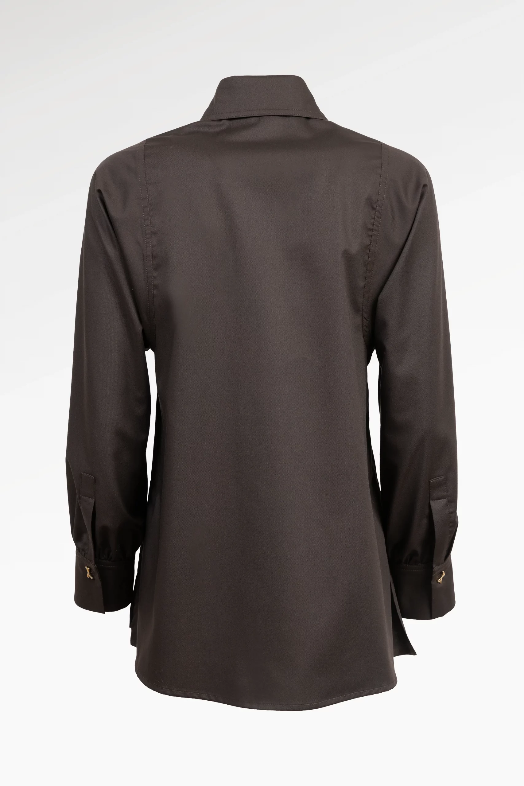 Chemise Naya en tissu marron chocolat, au tombé fluide et structuré et manches trois quarts.