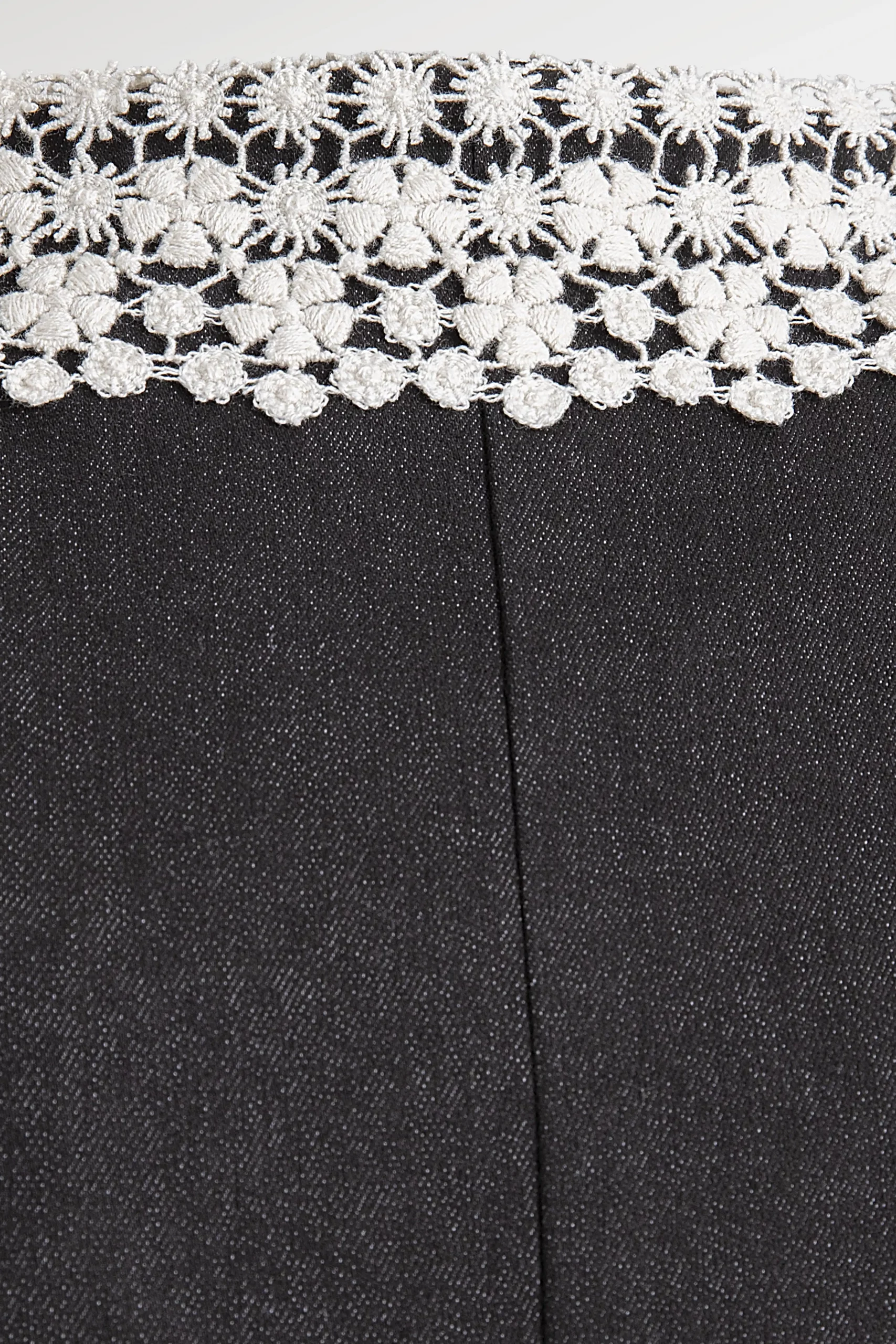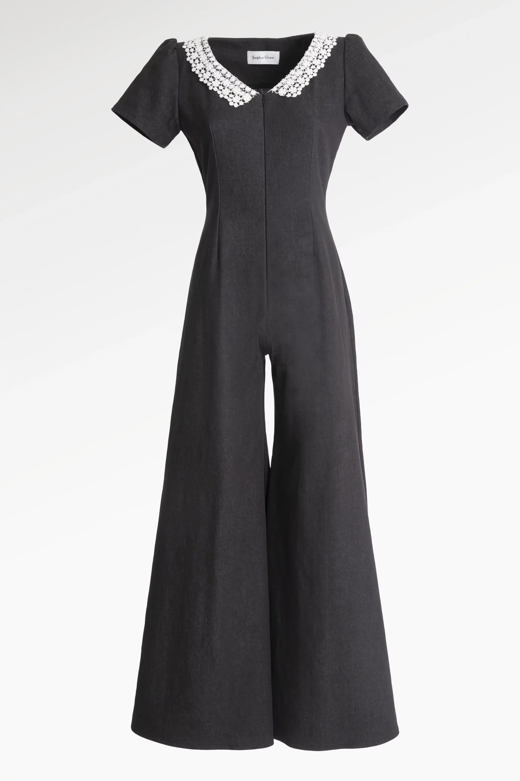 Cette combinaison confectionnée en denim stretch épouse la silhouette avec confort tout en offrant une tenue structurée et flatteuse. Le col orné de dentelle à fleurs apporte une touche de féminité et de raffinement, contrastant avec le caractère affirmé du denim.