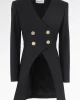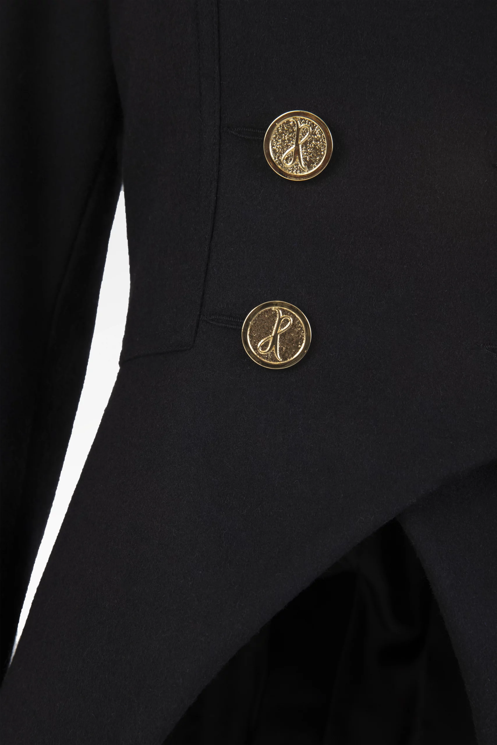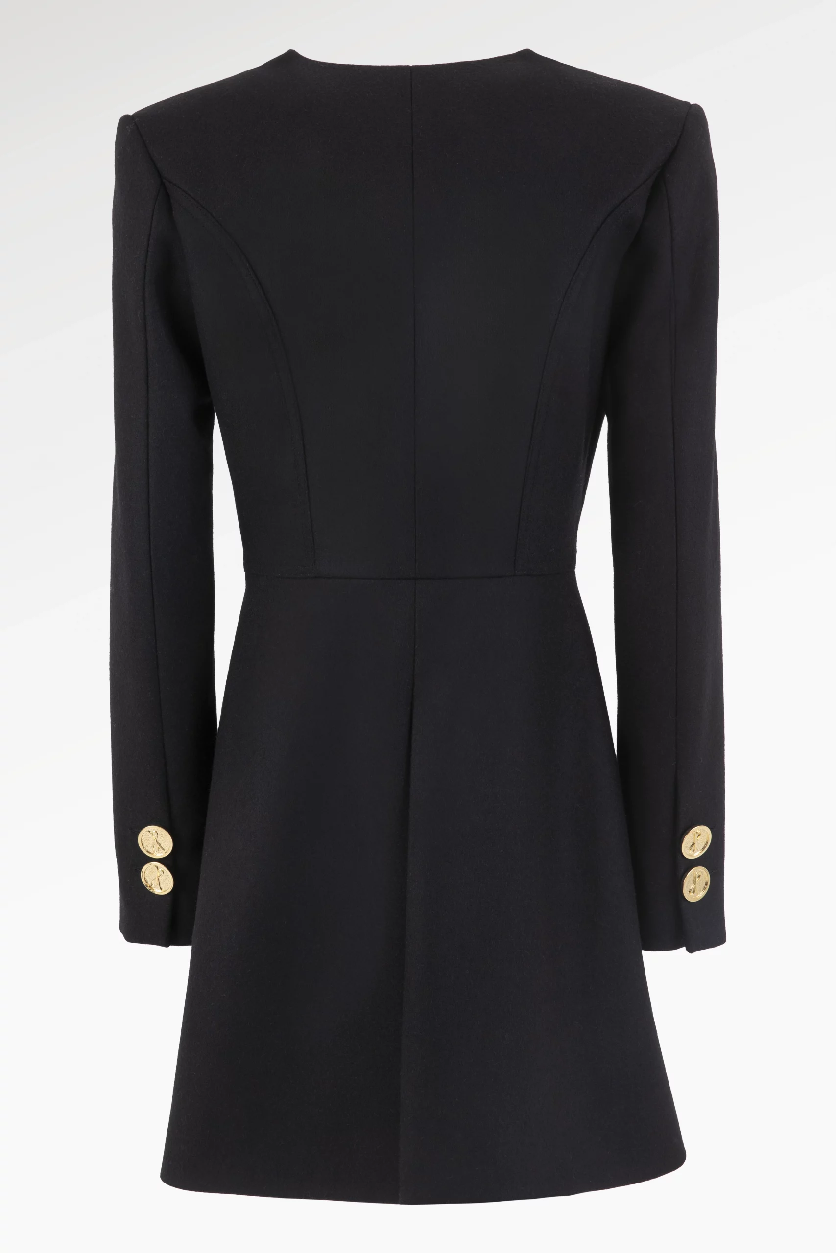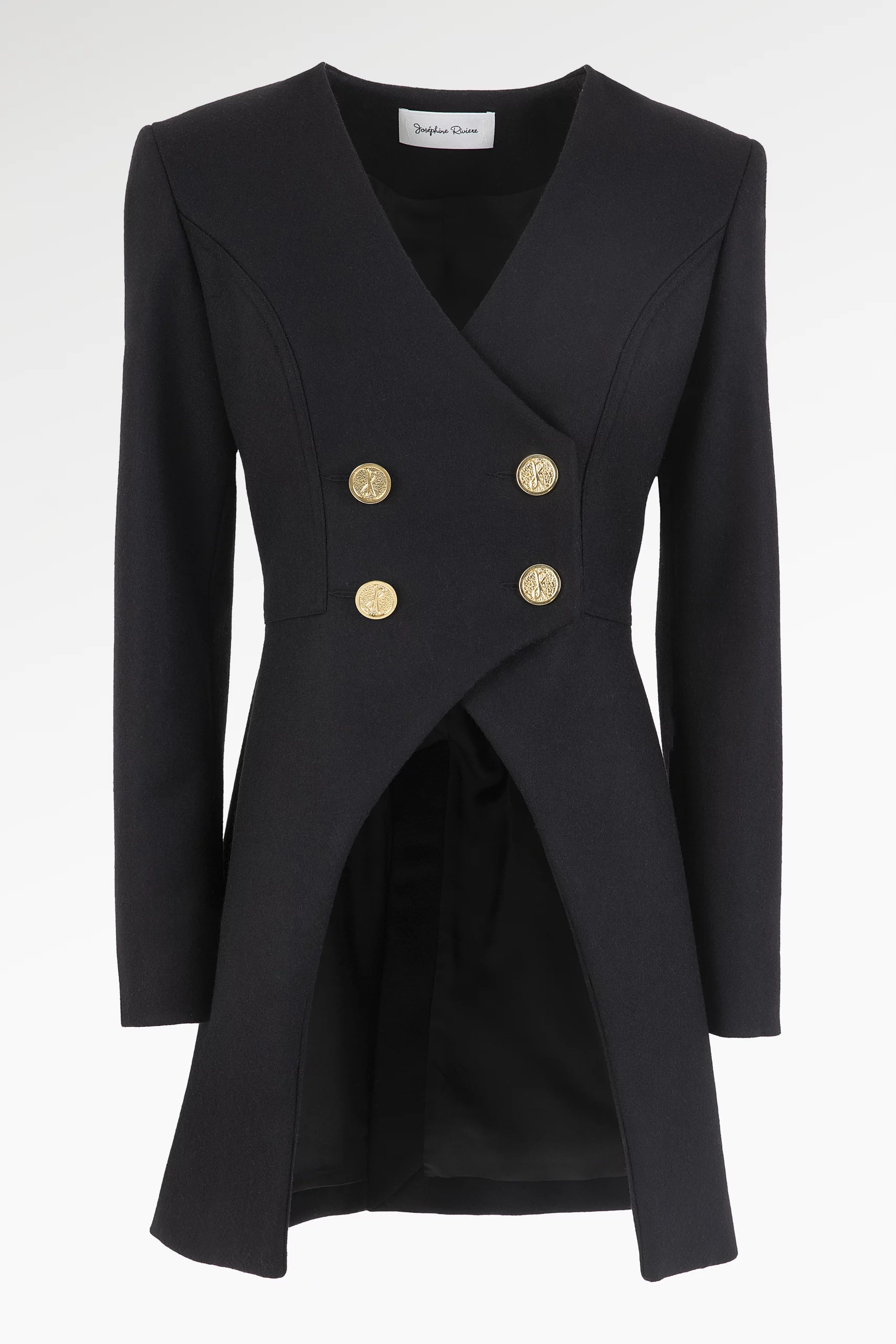 Frac en laine à la coupe ajustée et élégante, pensé pour sublimer la silhouette avec simplicité. Il se distingue par ses boutons bijoux JR, signature raffinée de la Maison, et par une fente centrale au dos qui apporte aisance et mouvement. Sa ligne structurée évoque l’allure tailleur, tandis que la douceur de la laine assure confort et port naturel.
