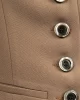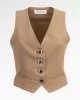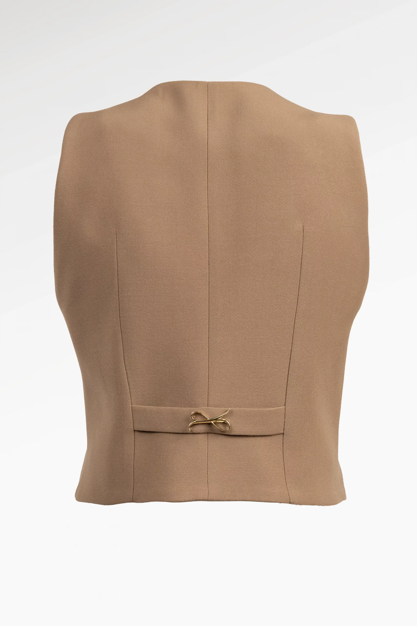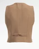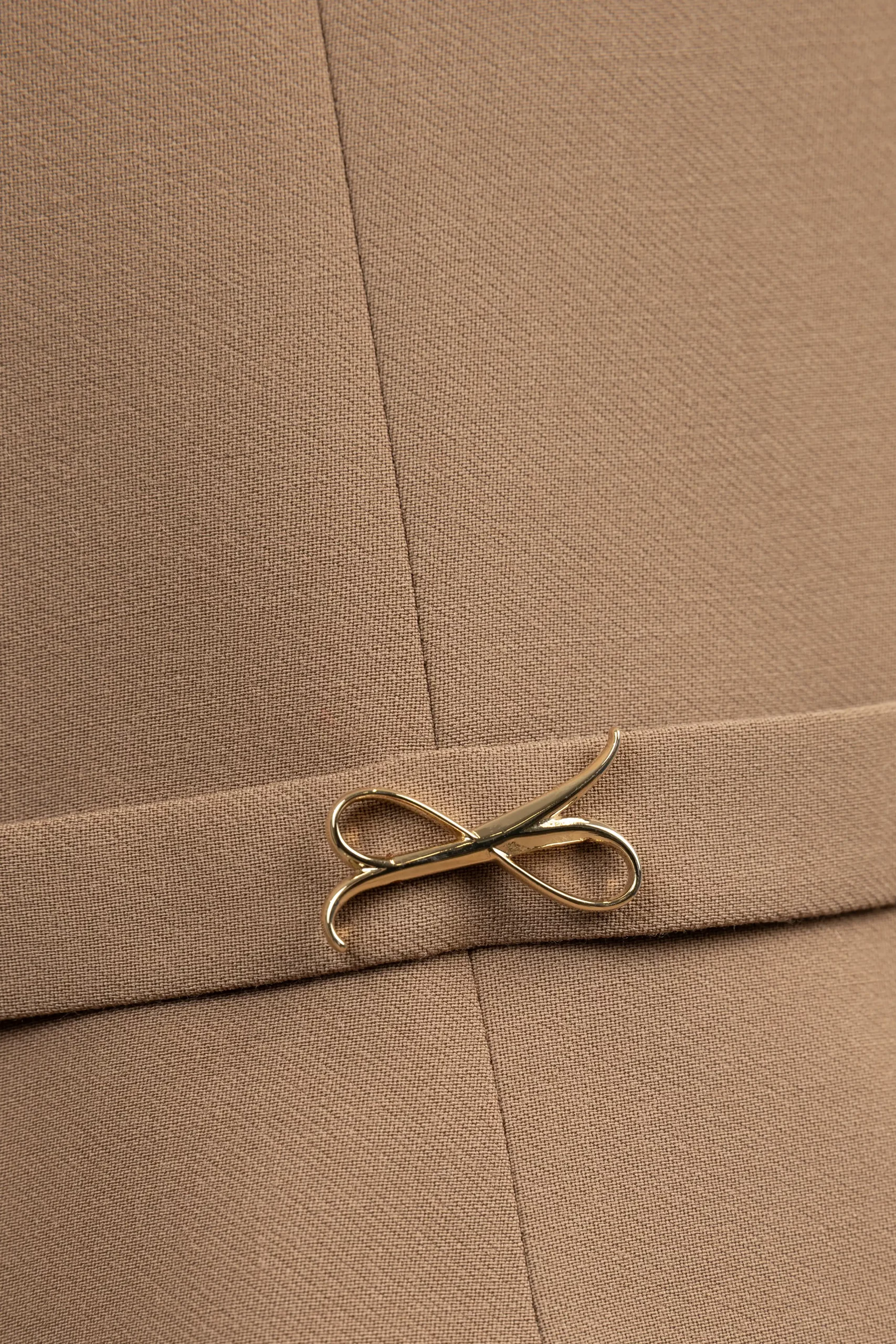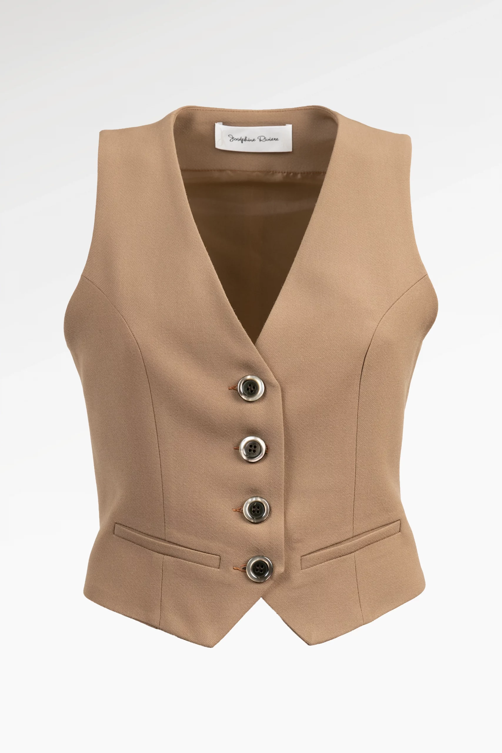 Gilet de costume coupe droite. Confectionné dans un drap de laine peignée de haute qualité, il s’associe au pantalon orée caramel. La martingale ornée du logo JR au dos apporte féminité à cette pièce issue du vestiaire masculin.