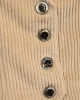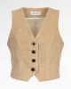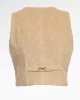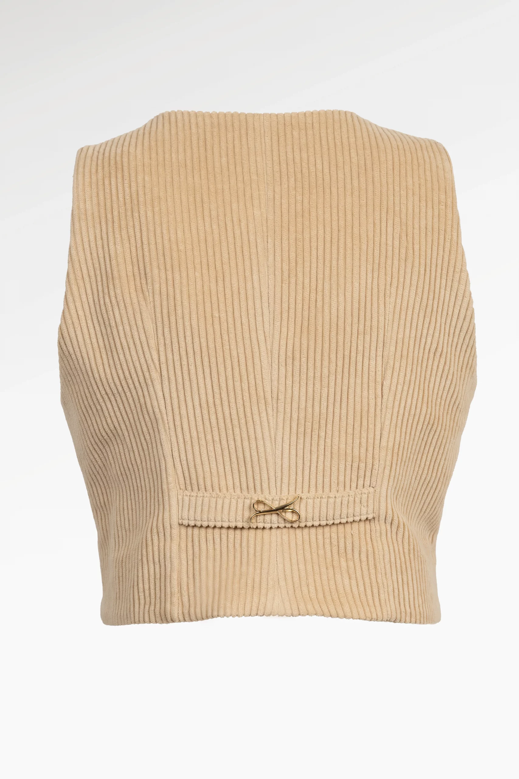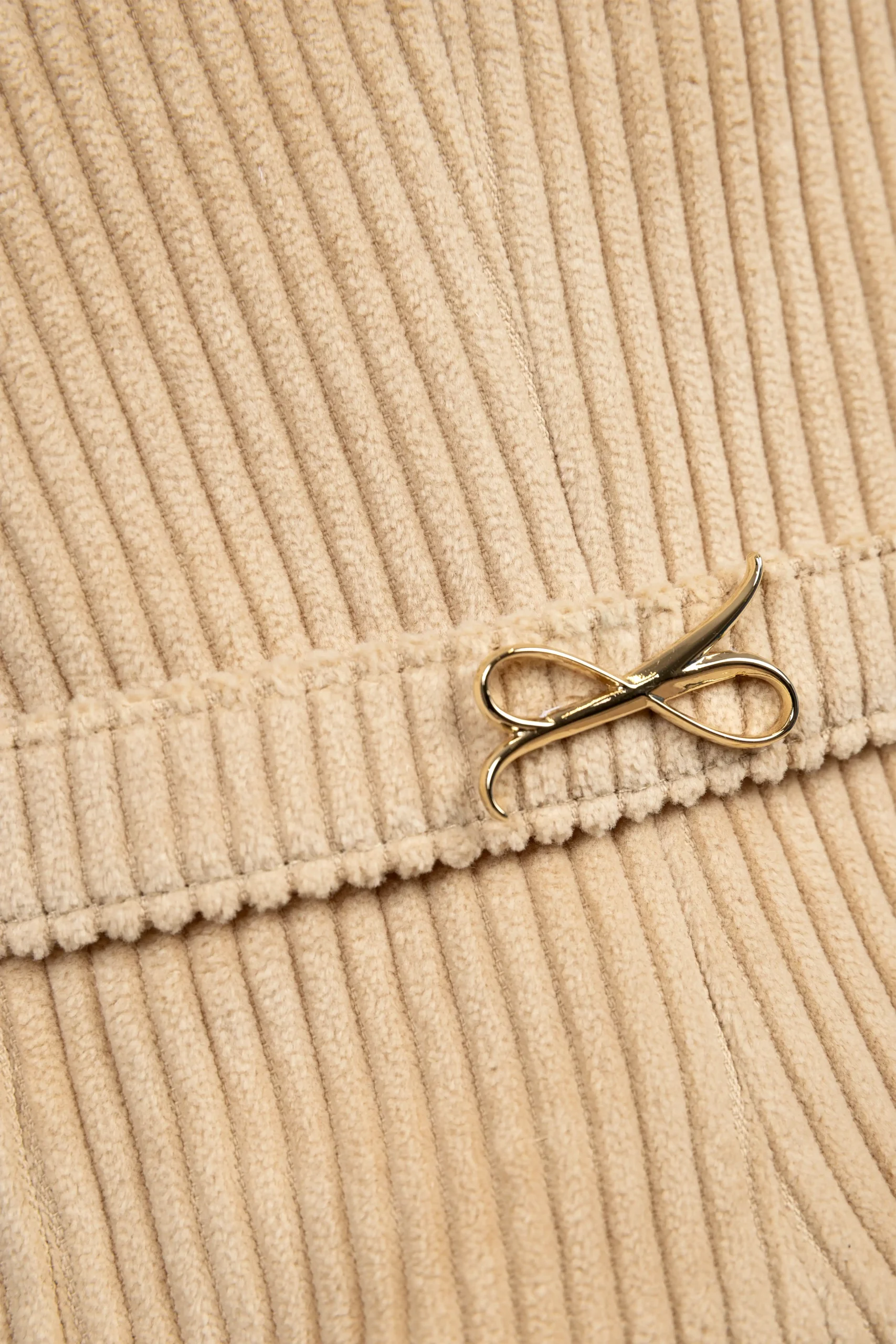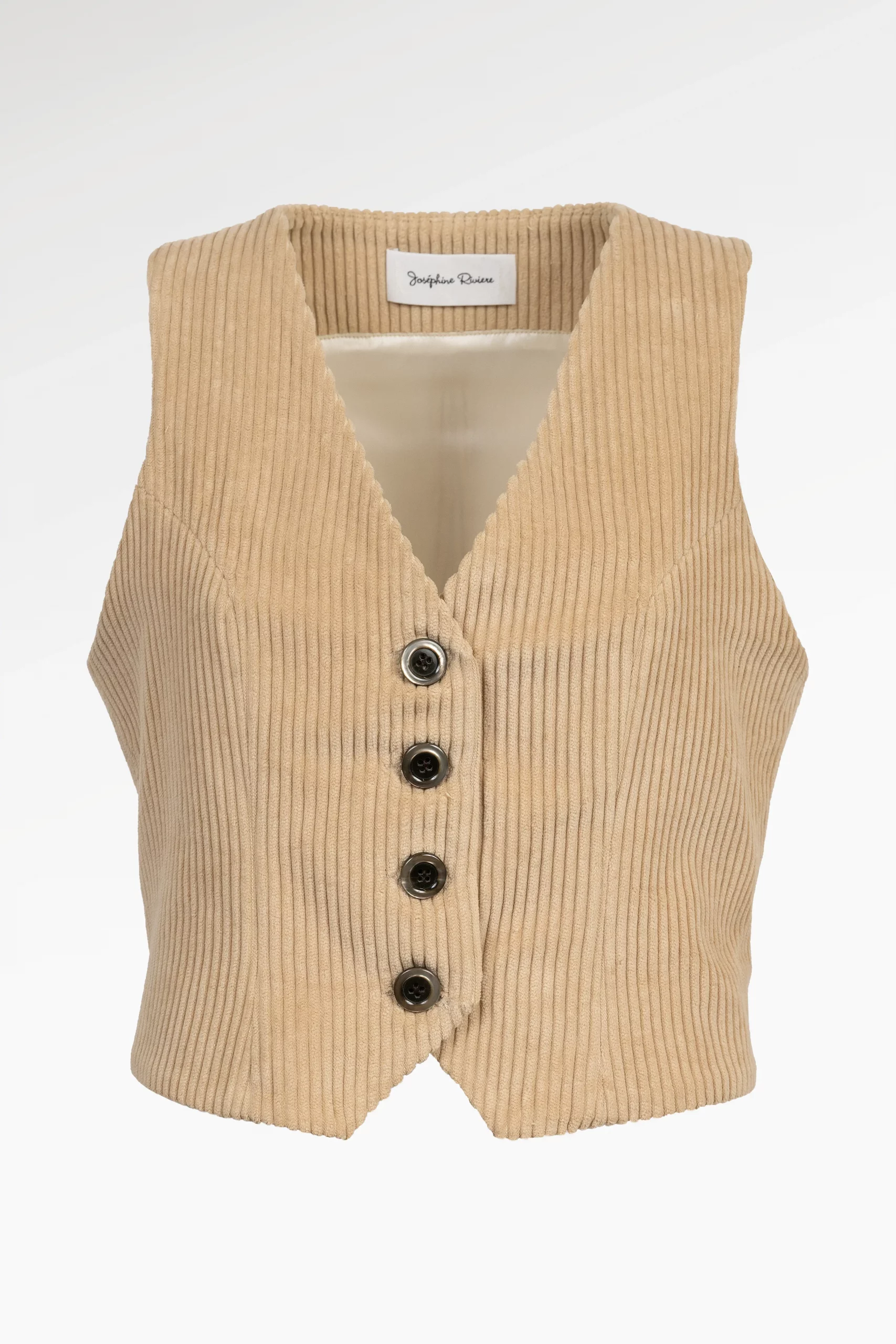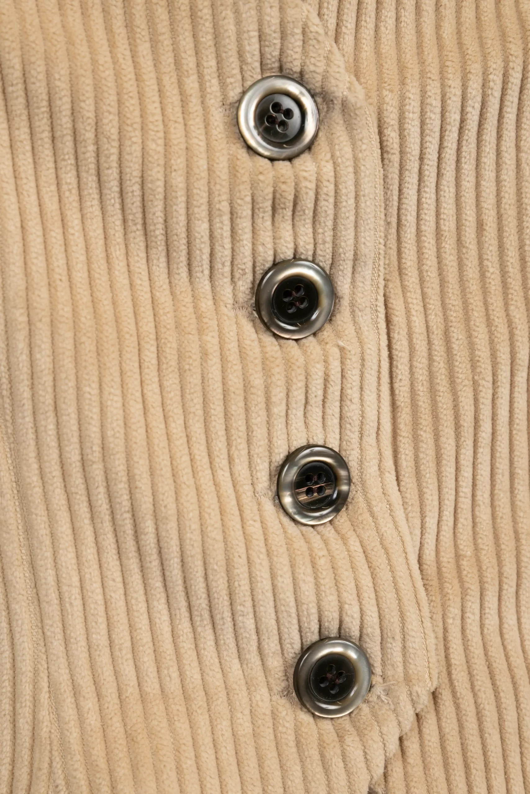 Gilet de costume coupe droite en velours. Confectionné en velours côtelé beige et doublure brillante de haute qualité, il s’associe au pantalon Allure velours et la veste en velours beige. La martingale ornée du logo JR au dos apporte féminité à cette pièce issue du vestiaire masculin.
