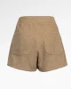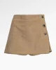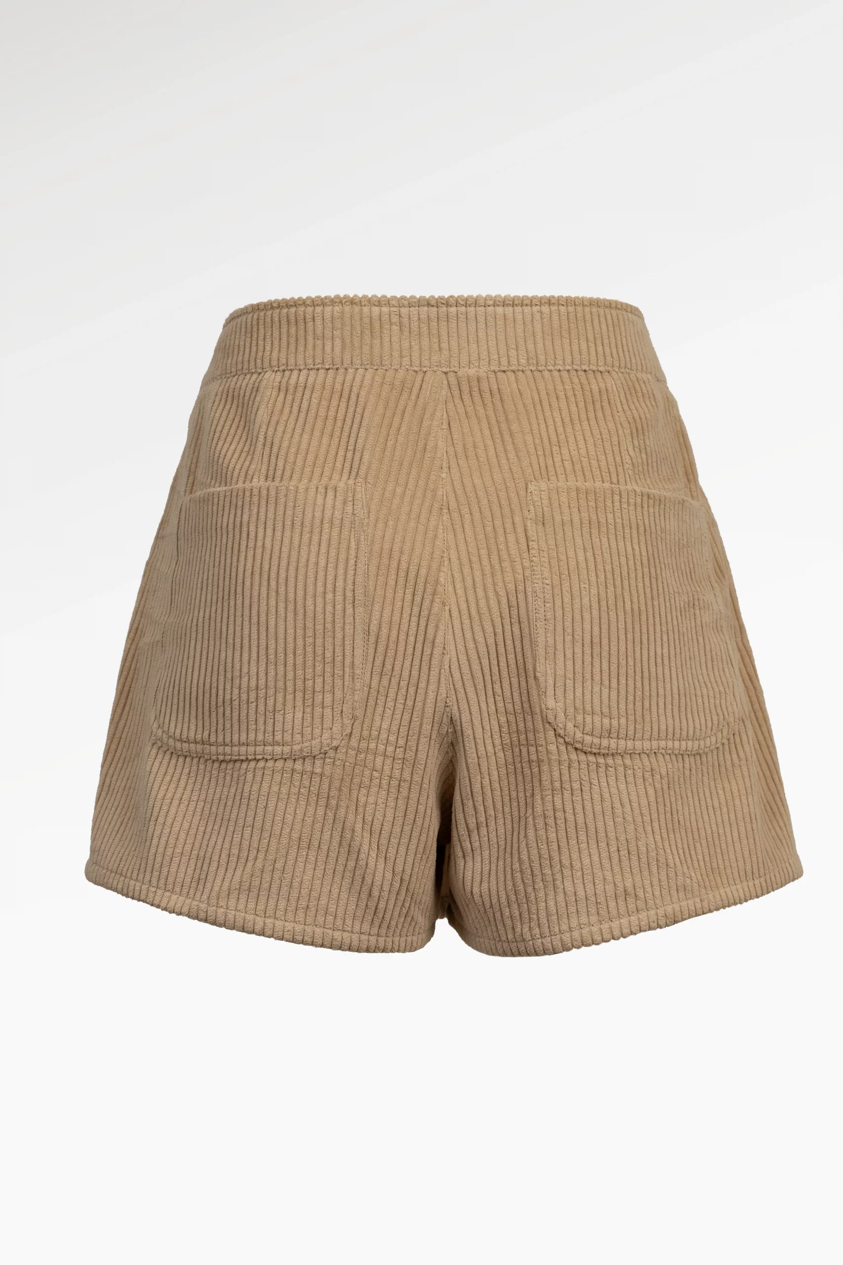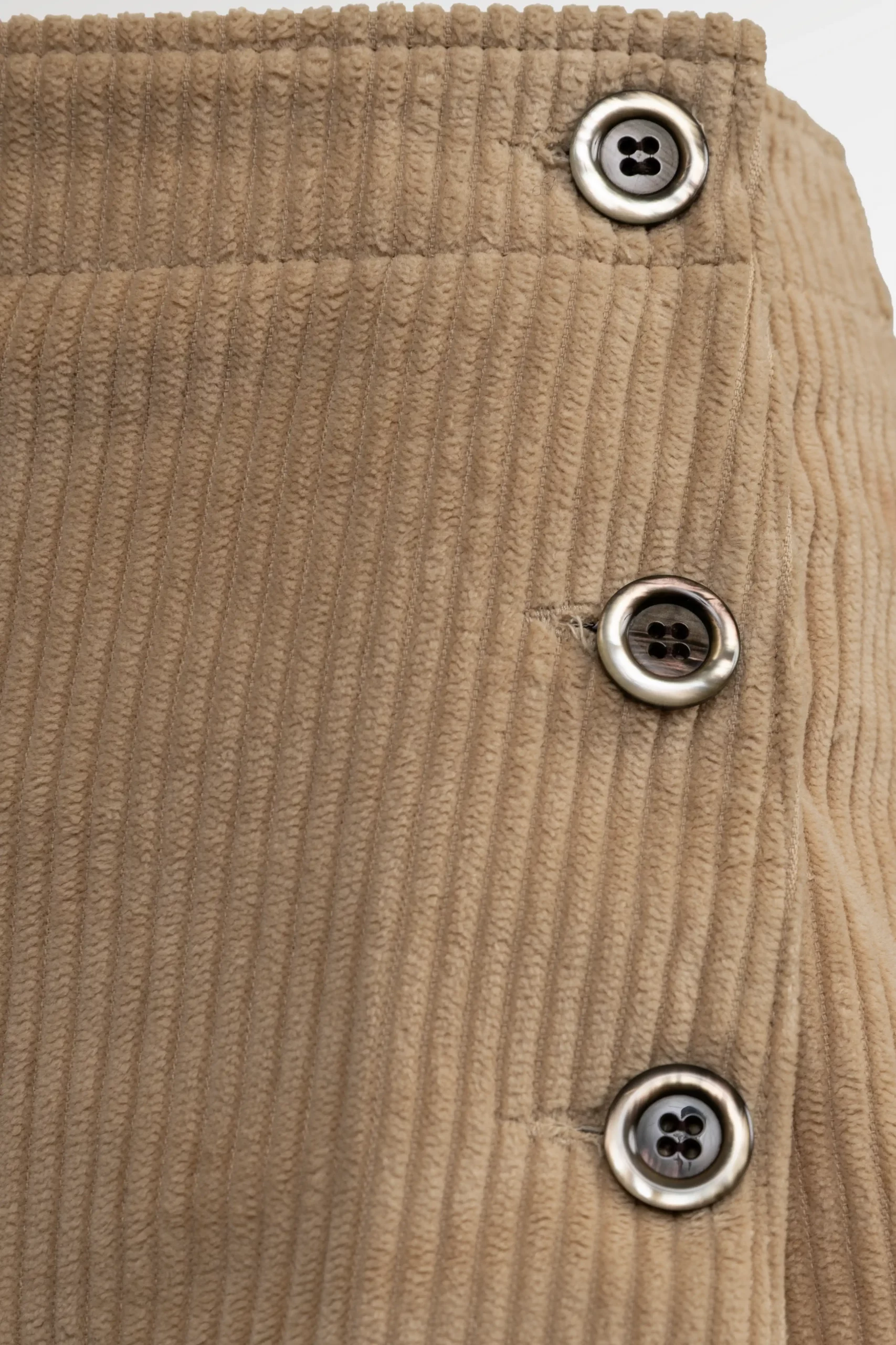 Jupe short en velours côtelé de coton. Elle présente des poches plaquées au dos et 3 boutons nacrés marron sur le devant. Elle s’associe parfaitement avec la veste et le gilet velours beige.
