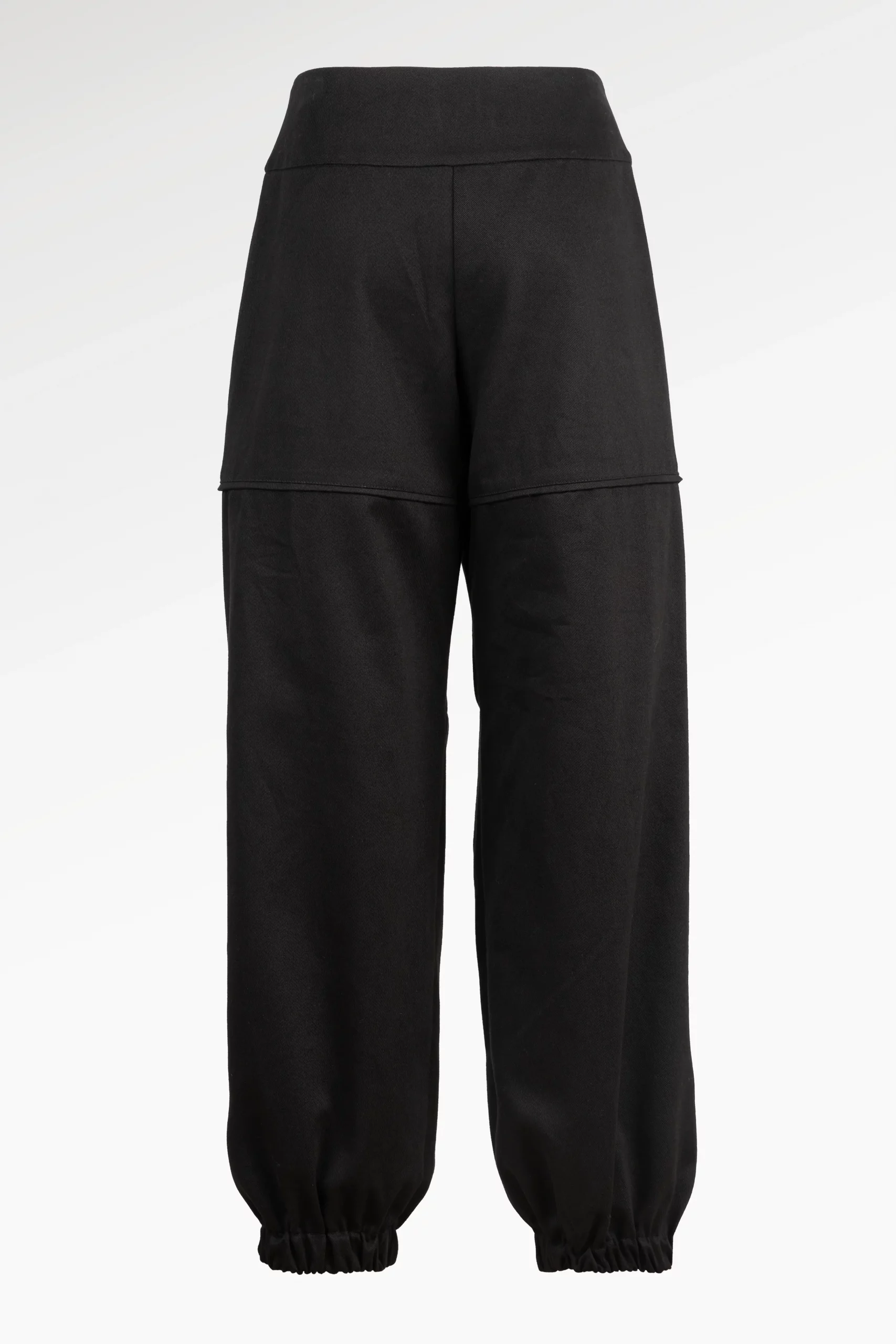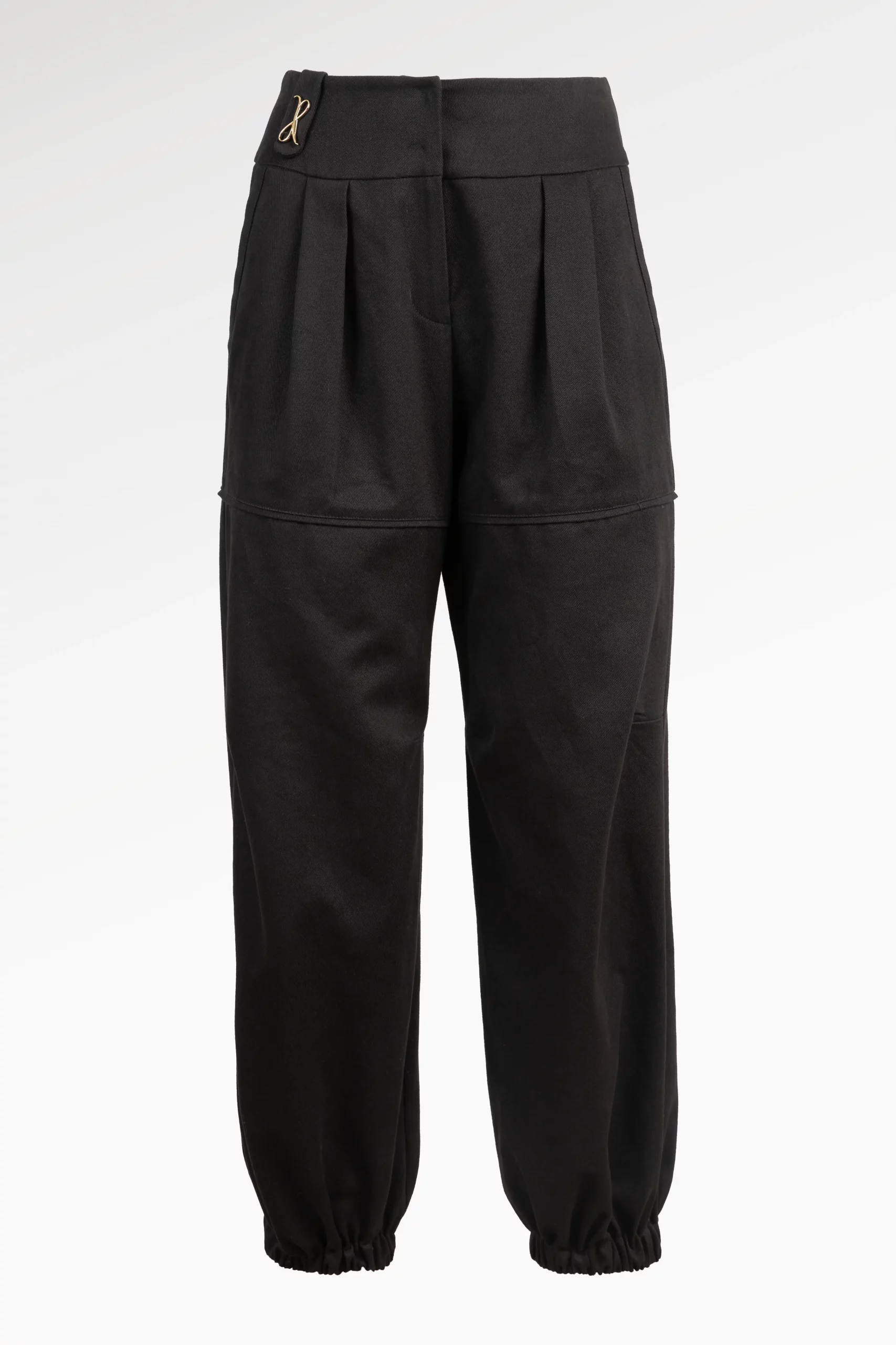 Pantalon large en gabardine de coton , à l’allure décontractée-chic. Il est doté de larges poches à l’italienne sur les côtés et d’un bas élastiqué aux chevilles pour une silhouette moderne. Il se ferme sur le devant par une braguette et des boutons pression, tandis qu’un passant unique orné du logo JR apporte une touche sophistiquée.