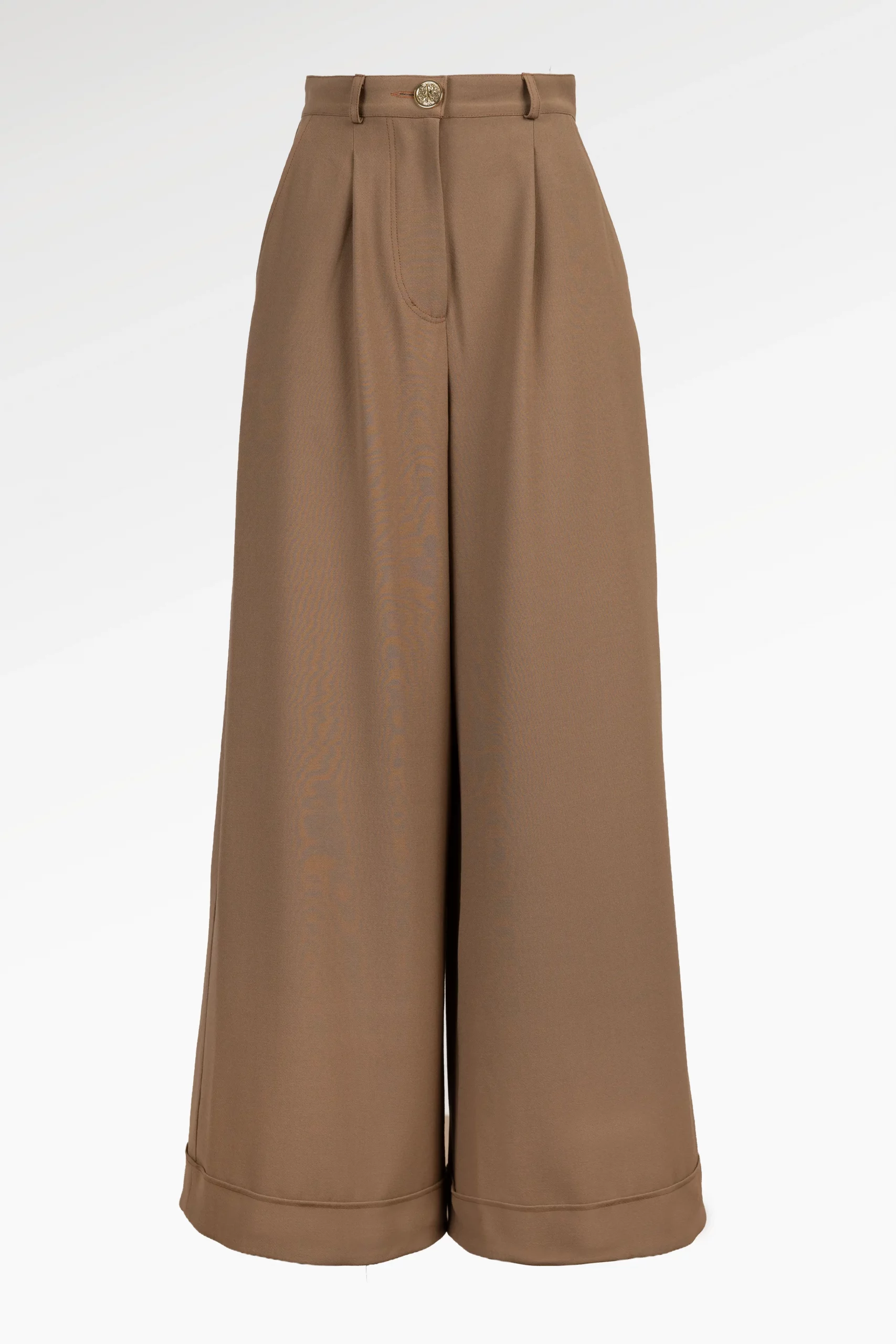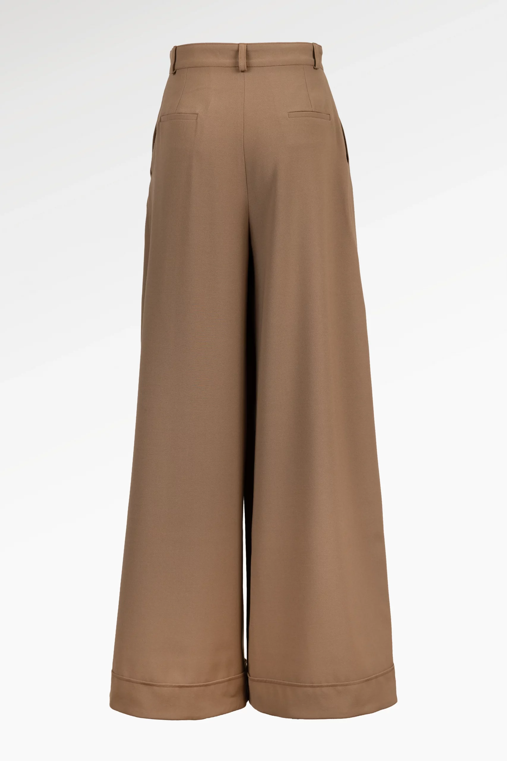 Pantalon taille haute en laine, à la coupe wide leg, offrant un volume ample et parfaitement structuré.