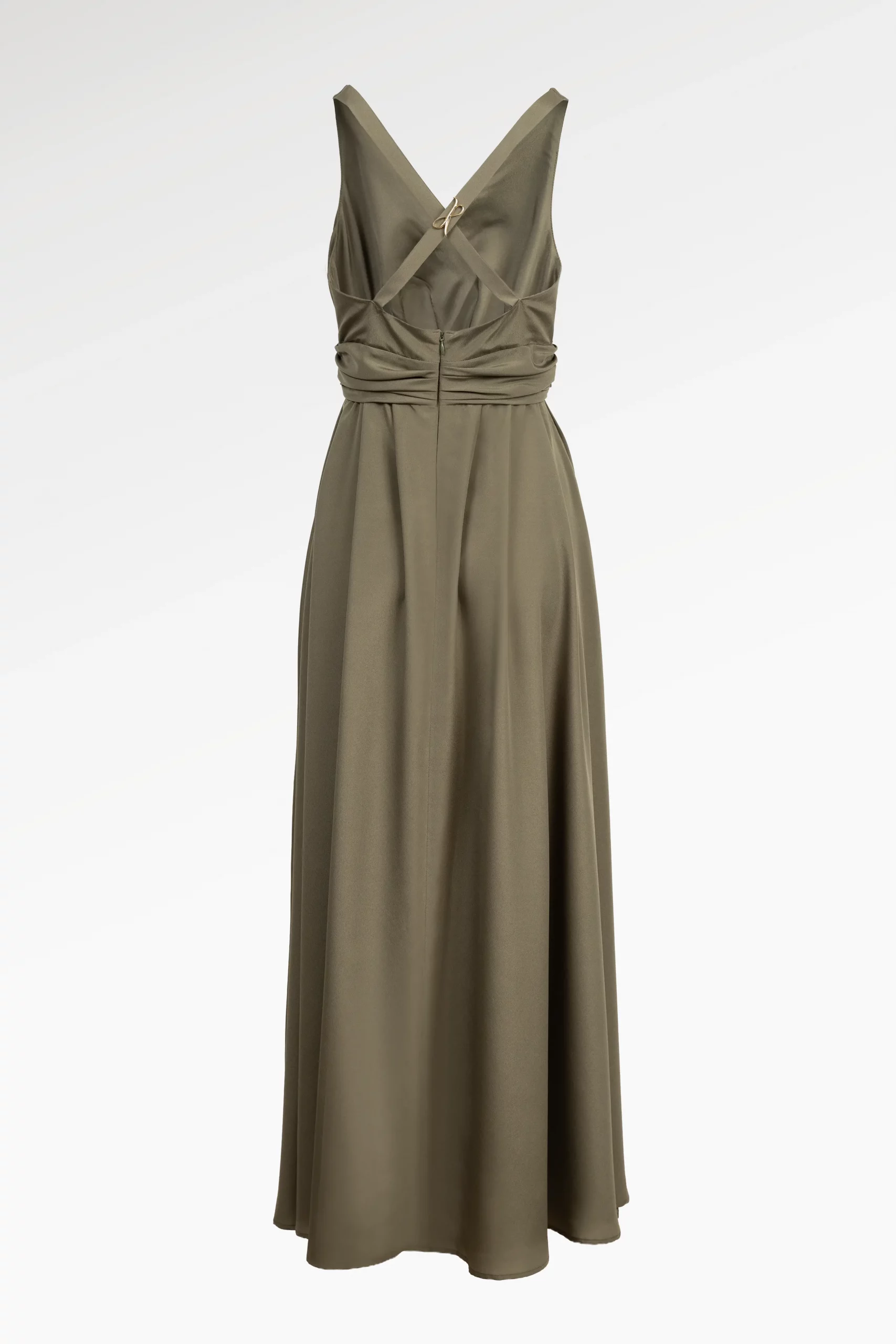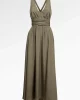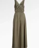 Sophistiquée et fluide, cette robe longue en crêpe de chine kaki incarne une élégance naturelle et contemporaine. Son décolleté en V profond met en valeur le buste avec subtilité, tandis que sa ceinture drapée à la taille structure la silhouette.
