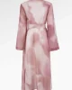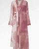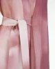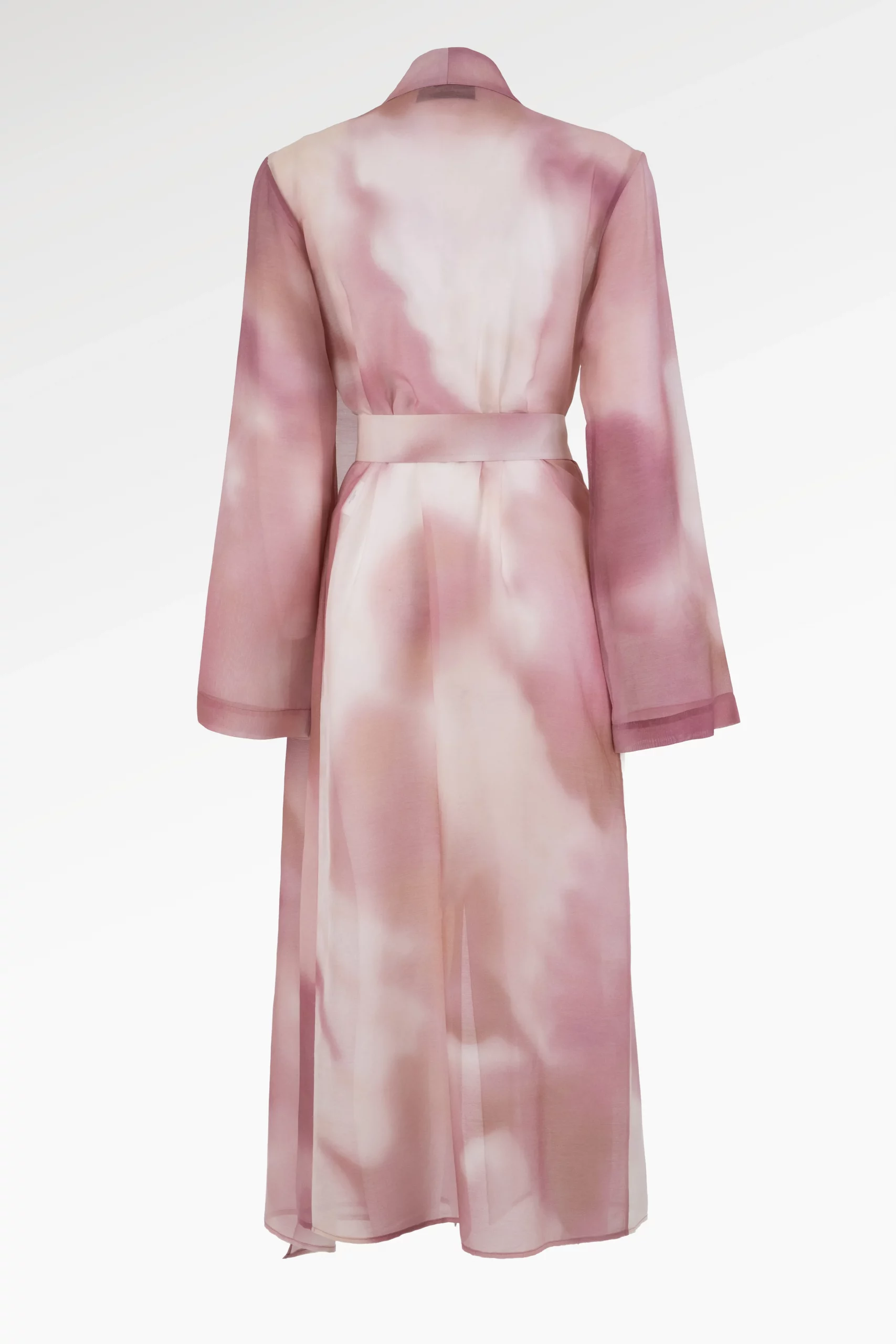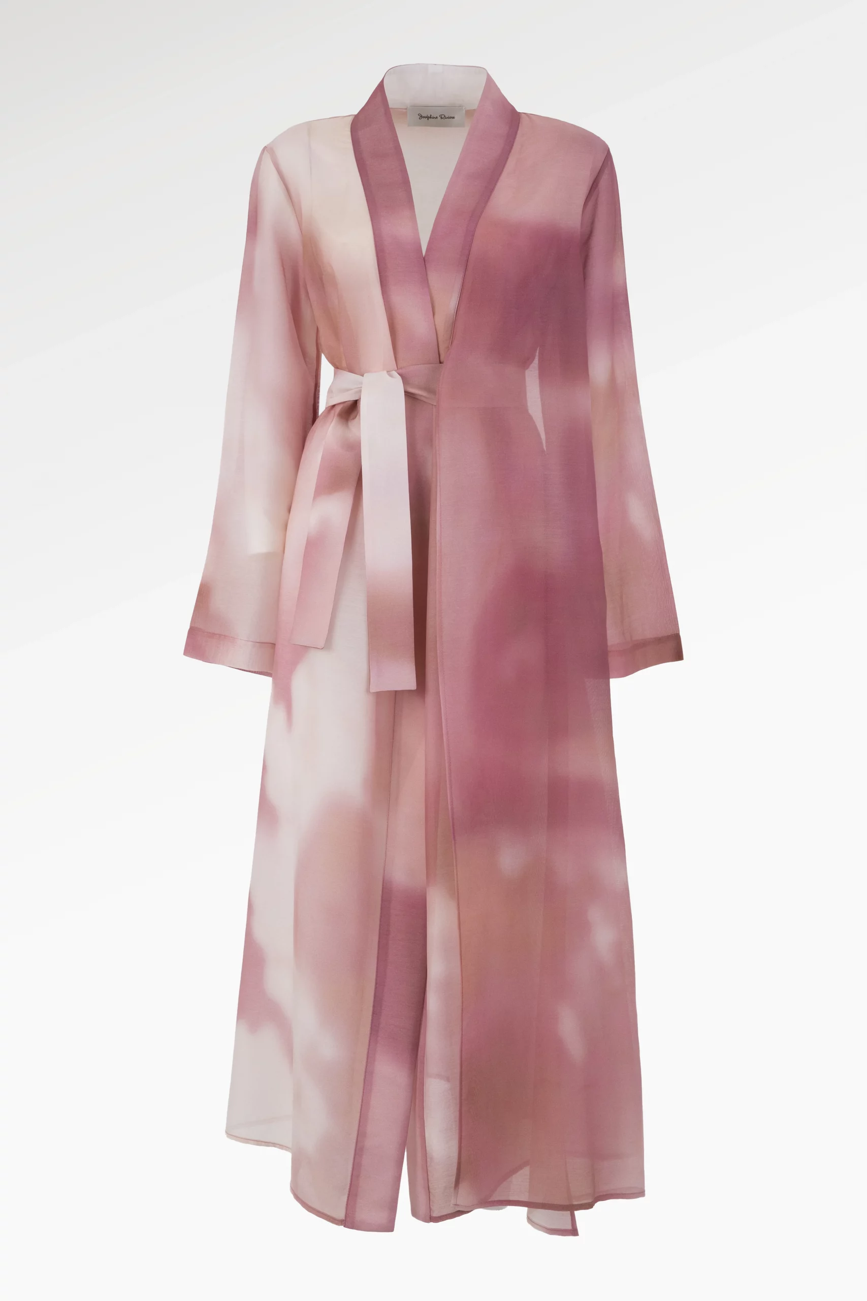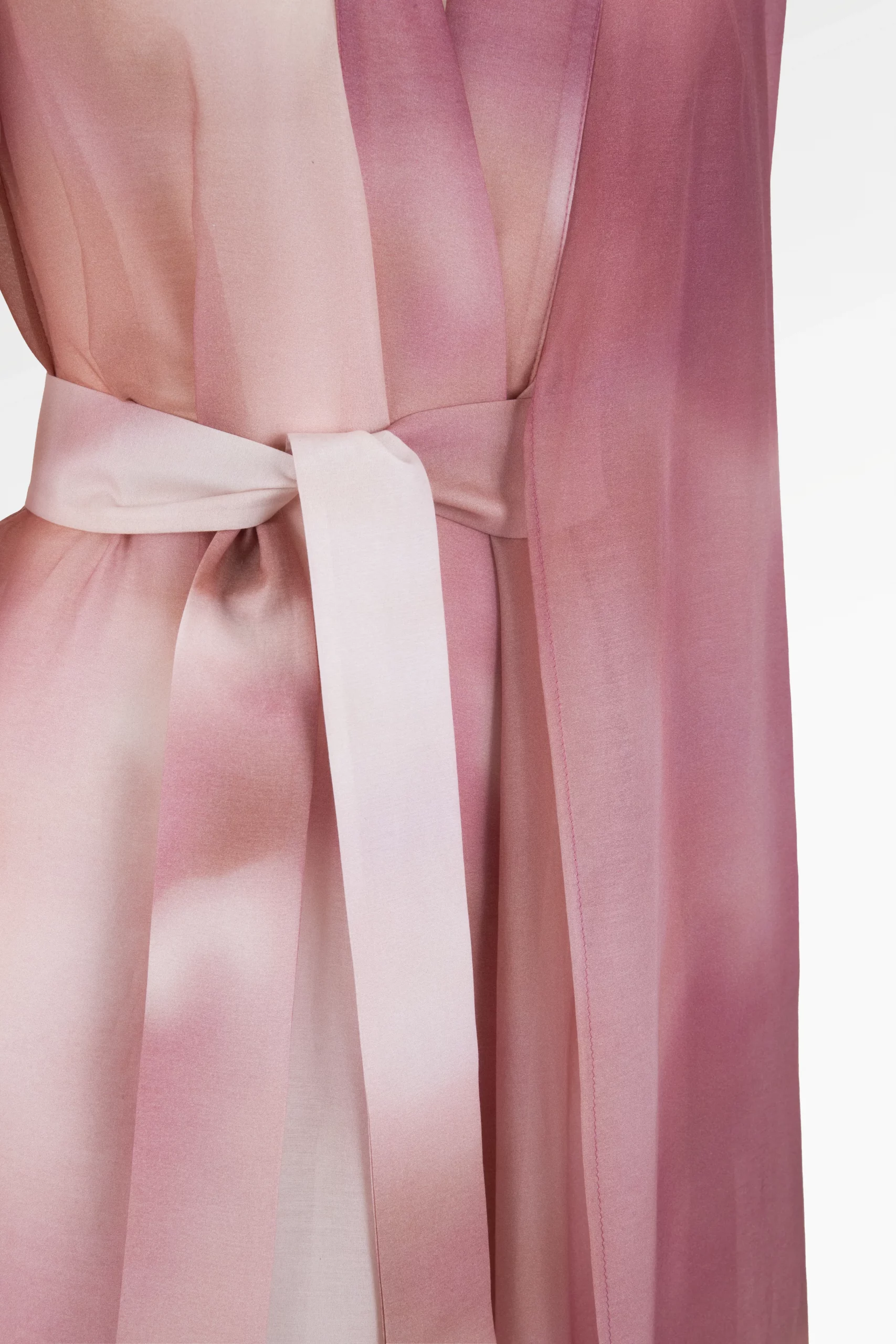 Robe semi-transparente en mousseline de coton et de soie, légère et lumineuse. Sa silhouette est sublimée par un long drapé fluide sur le devant gauche, tandis qu’une ceinture amovible marque délicatement la taille. Une pièce à la fois aérienne et sophistiquée.