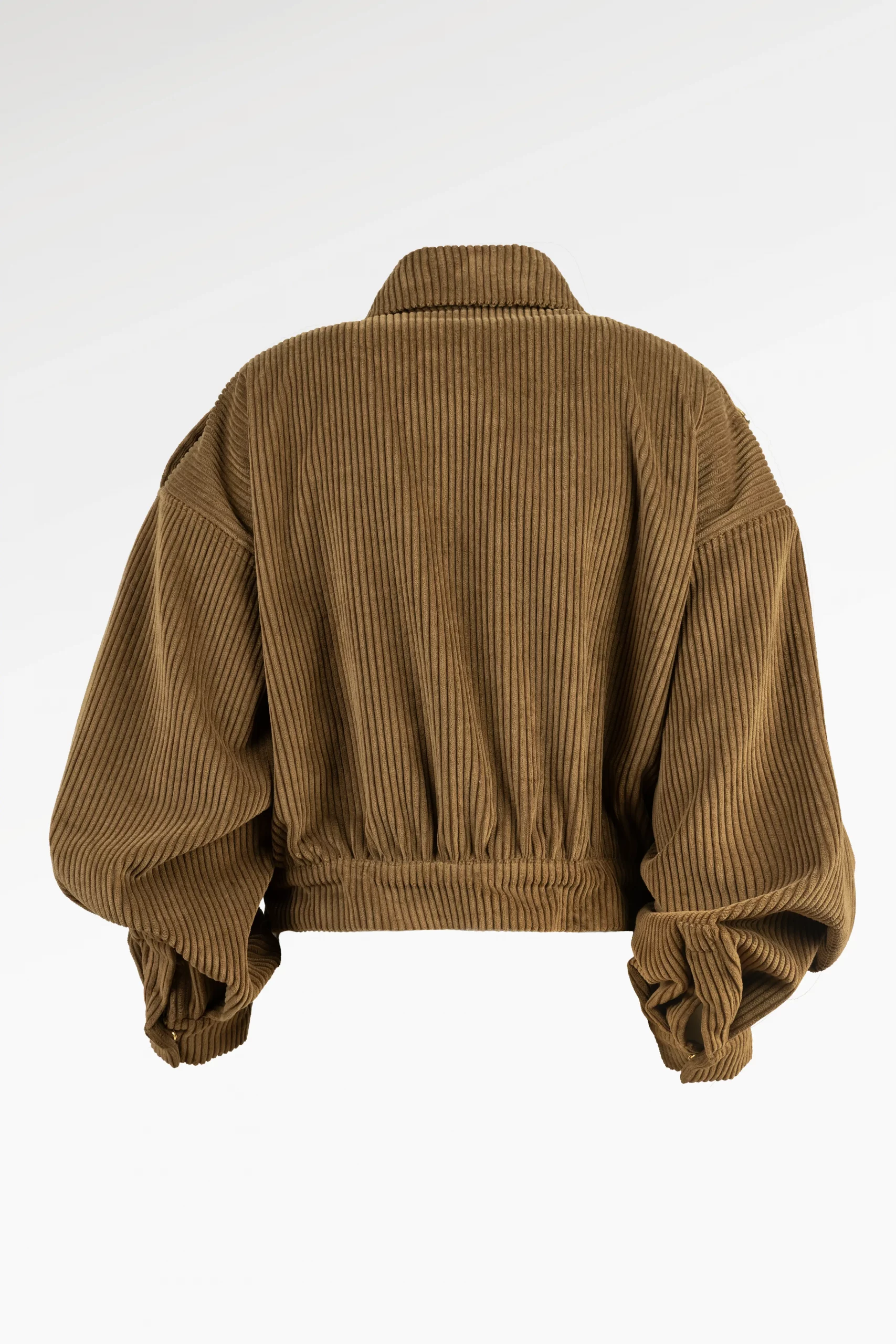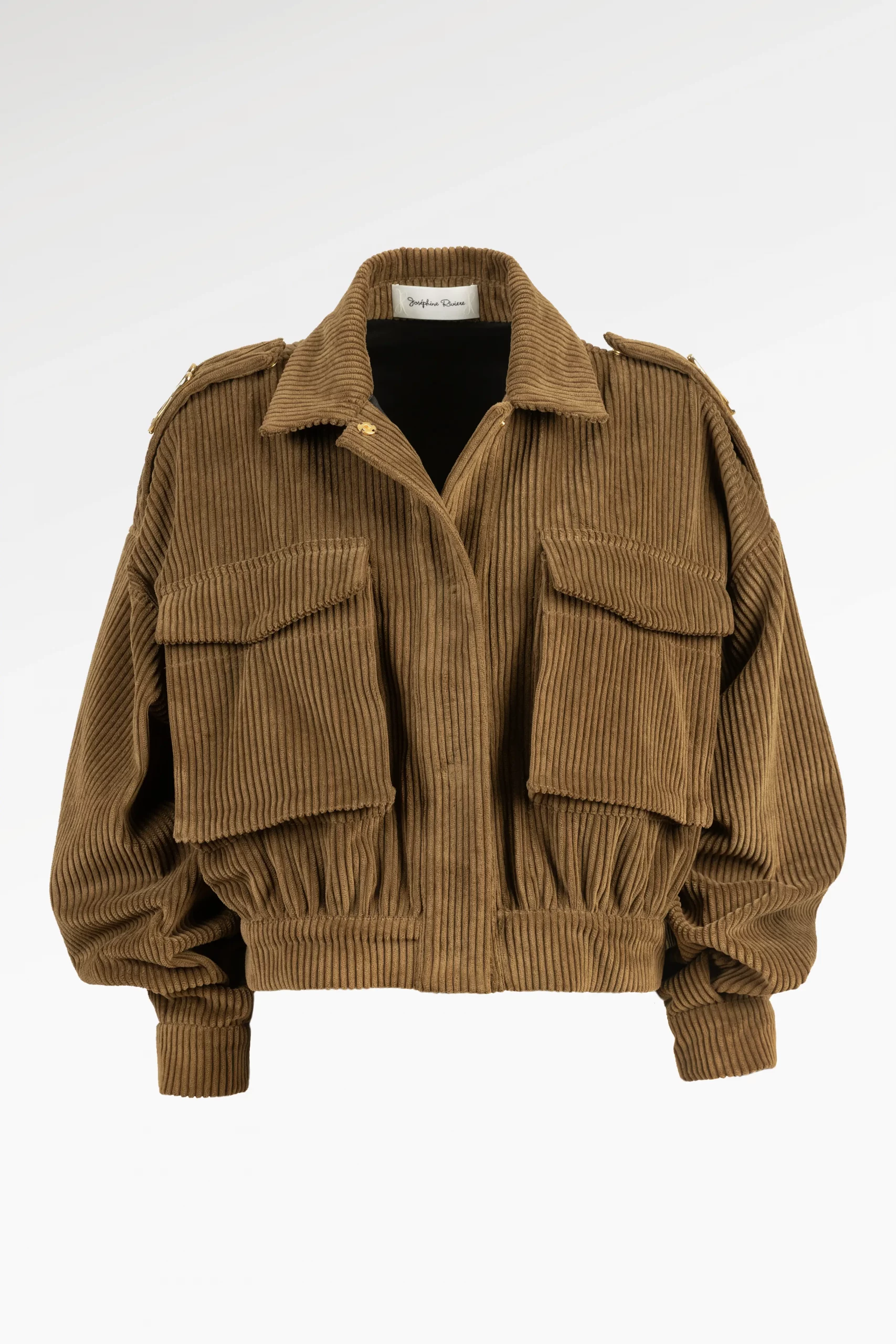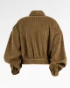 Veste kaki courte façon bomber en velours côtelé, au volume maîtrisé et à la coupe délicatement structurée pour sublimer la silhouette. Les boutons pressions bijoux discrets et les pattes d’épaule ornées du logo JR apportent une touche lumineuse et raffinée. Une pièce à l’allure libre et sophistiquée, parfaite pour sublimer les silhouettes du quotidien.